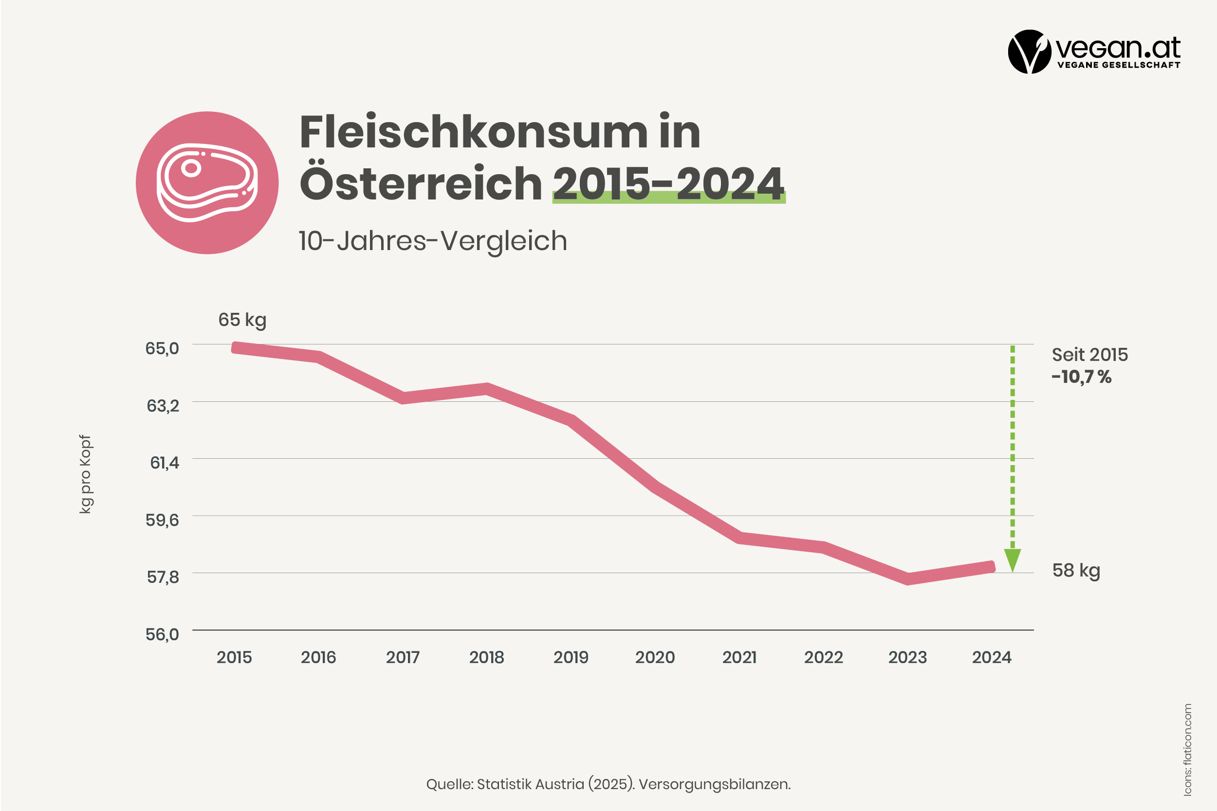 Die neuesten Zahlen der Statistik Austria für das Jahr 2024 zeigen: Der Fleischkonsum in Österreich hat mit 58 kg pro Kopf im Vergleich zu 2023 um 400 g zugenommen. Auch wenn die Schlagzeilen vorrangig diesen geringfügigen Anstieg thematisieren, ändert dies nichts am übergeordneten Bild: Der langfristige Abwärtstrend beim Fleischverbrauch ist ungebrochen.