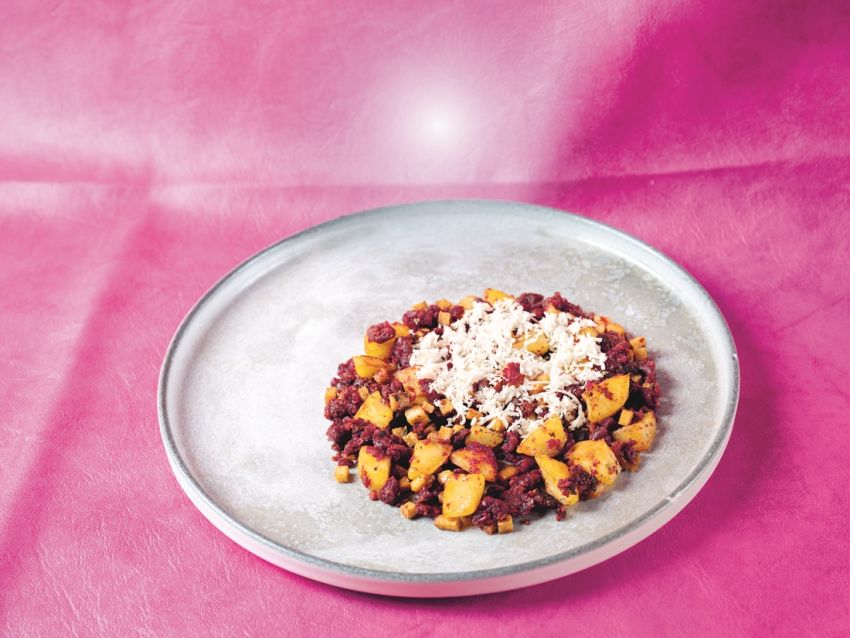 - Rote Rüben schälen und würfeln. Tofu fein reiben.