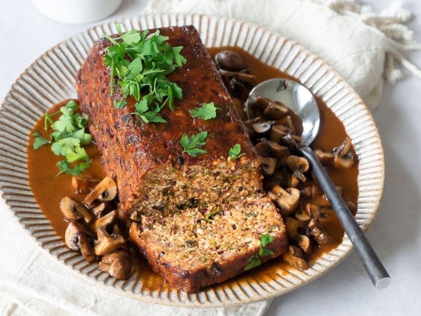 Dann das eingeweichte Brot und den angebratenen Tofu sowie Senf, Tomatenmark und Sojasauce dazugeben. Nochmals kurz schreddern. Die Konsistenz sollte nicht zu weich sein, sondern durchaus noch leicht stückig. Solltest du keinen Food-Processor haben, kannst du auch alle Zutaten hacken oder mit der Gabel zerdrücken. Eine Kastenform von 18 cm Länge mit Backpapier auslegen. Die Bratenmasse hineingeben. Mit einem Löffel leicht andrücken, dann ca. 30 Minuten backen. Für die Glasur in einer Schüssel Sojasauce, Tomatenmark, Ahornsirup und Öl glattrühren. Den Braten vorsichtig auf ein Backblech stürzen und mit der Glasur rundherum bestreichen. Dann abermals 15 Minuten backen.