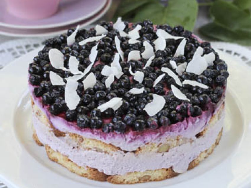 5. zum abschluss mit tiefgefrorenen(!) heidelbeeren belegen und nach geschmack puderzucker darüberstäuben. einige stunden im kühlschrank durchziehen lassen!