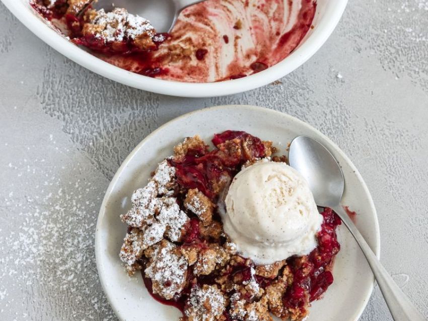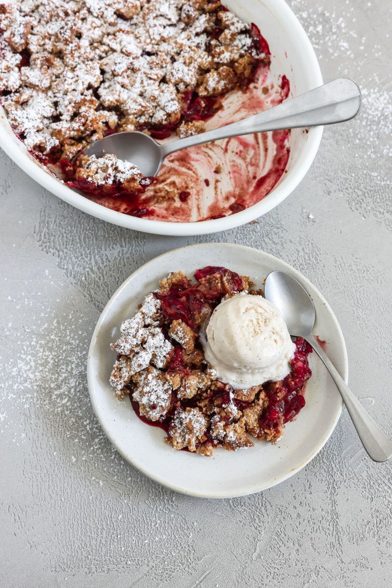 5. Anschließend noch warm mit Puderzucker bestäuben und servieren. Vanilleeis oder Schlagsahne passen auch hervorragend dazu. Gut gekühlt hält sich der Crumble bis zu 2 Tage.