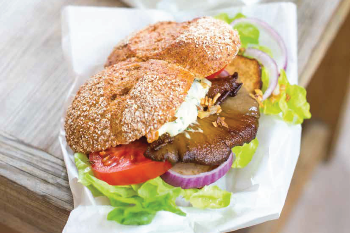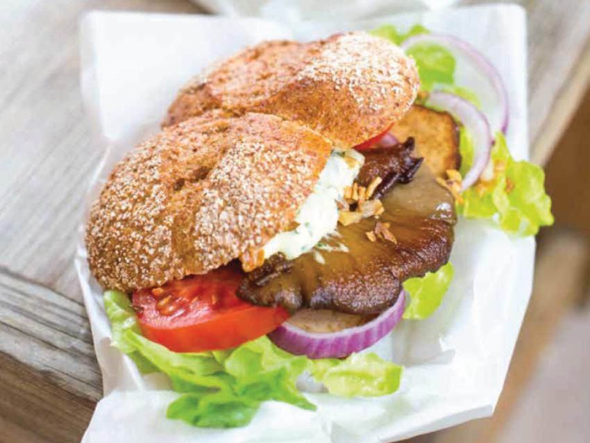 Die Brötchen aufschneiden und die Schnittflächen mit der Remoulade bestreichen. Auf die Böden je 1 Salatblatt, Zwiebelringe, Tomatenscheiben, 1 Pilz, etwas Knoblauch und 1 Tofuscheibe schichten. Nach Belieben noch einen Klecks Senf und Ketchup daraufgeben, die Brötchen zusammenklappen und servieren.