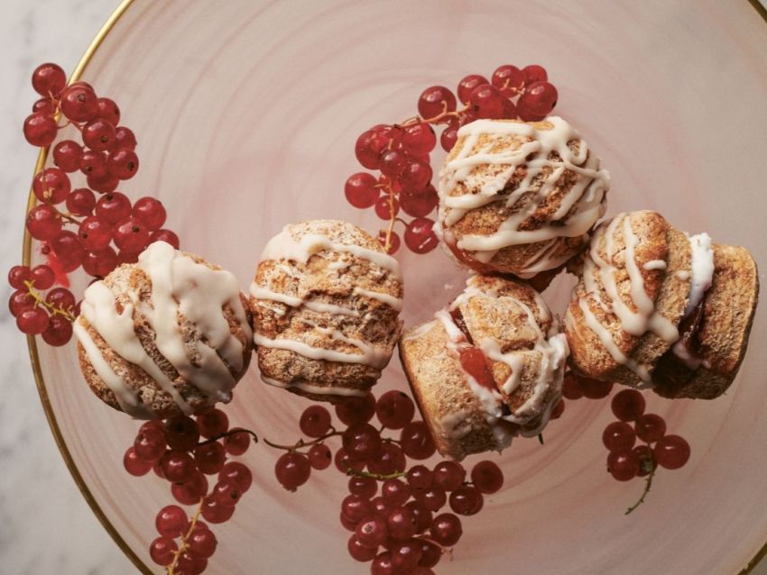 Im vorgeheizten Backofen 12–15 Minuten backen, bis die Ränder und die Unterseite goldgelb sind. Die Scones 5 Minuten auf dem Backblech abkühlen lassen. Die noch warmen Scones in der Mitte aufschneiden, mit aufgeschlagener Kokossahne und Konfitüre füllen, die Oberseite aufsetzen. Direkt servieren.