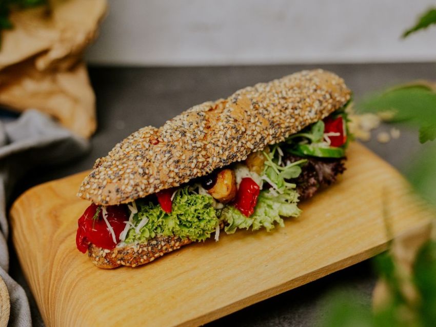 - Nun kannst du deine Kornstangerl mit dem Gemüse belegen. Wir empfehlen gegrillte und eingelegte Paprika, Gurkenscheiben, ein bisschen Kren, Eisbergsalat und Erbsensprossen dazu. Ganz oben belegst du das Stangerl mit den goldgelb gebratenen Tempeh-Würfeln.