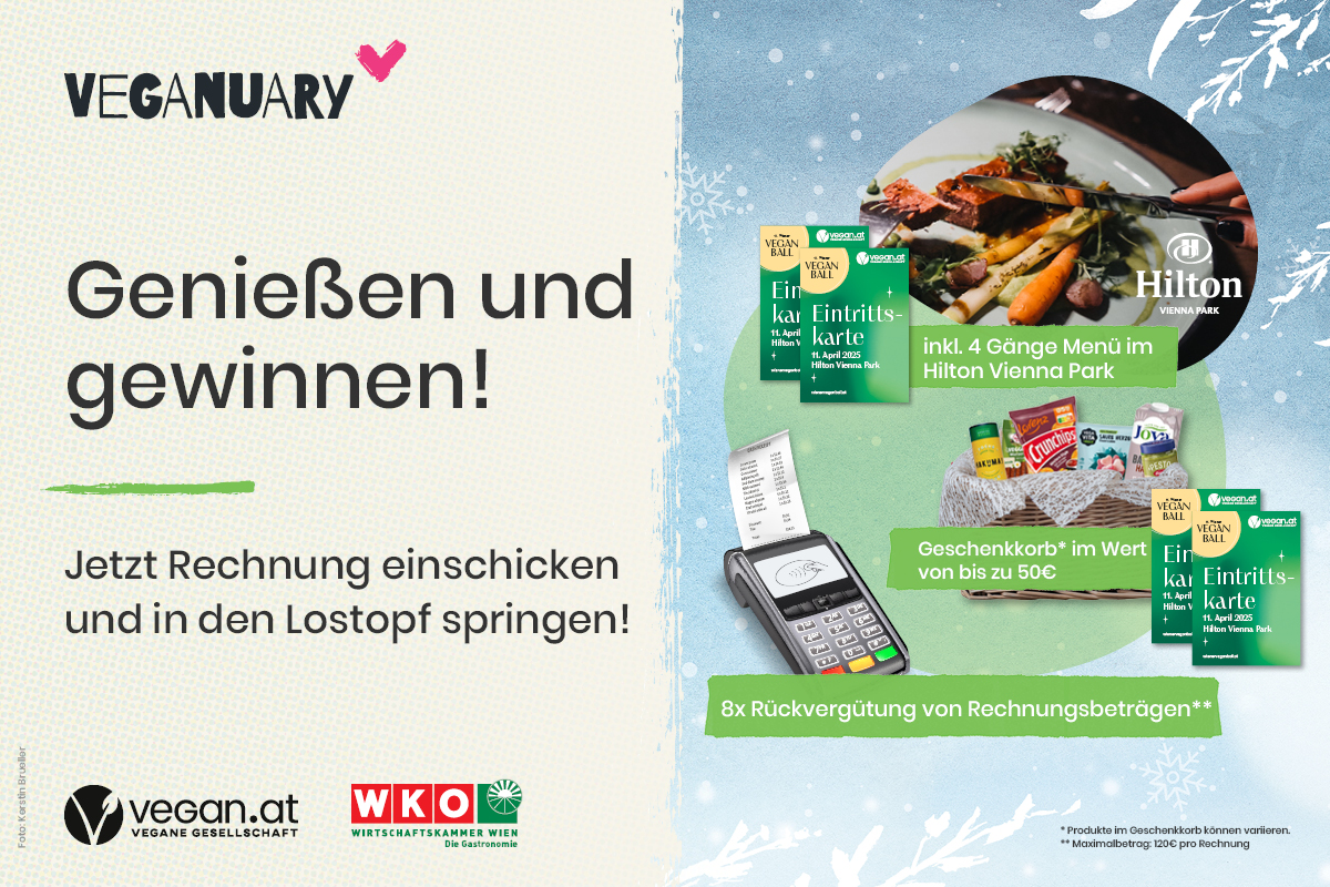 Gemeinsam mit der Fachgruppe Gastronomie der Wirtschaftskammer Wien laden wir euch ein, beim Veganuary 2026 die pflanzliche Vielfalt zu entdecken! Wer im Zeitraum 1. bis 31. Jänner 2026 in einem Wiener Gastronomiebetrieb eine pflanzliche Speise genießt, kann automatisch am großen Veganuary-Wien-Gewinnspiel teilnehmen.